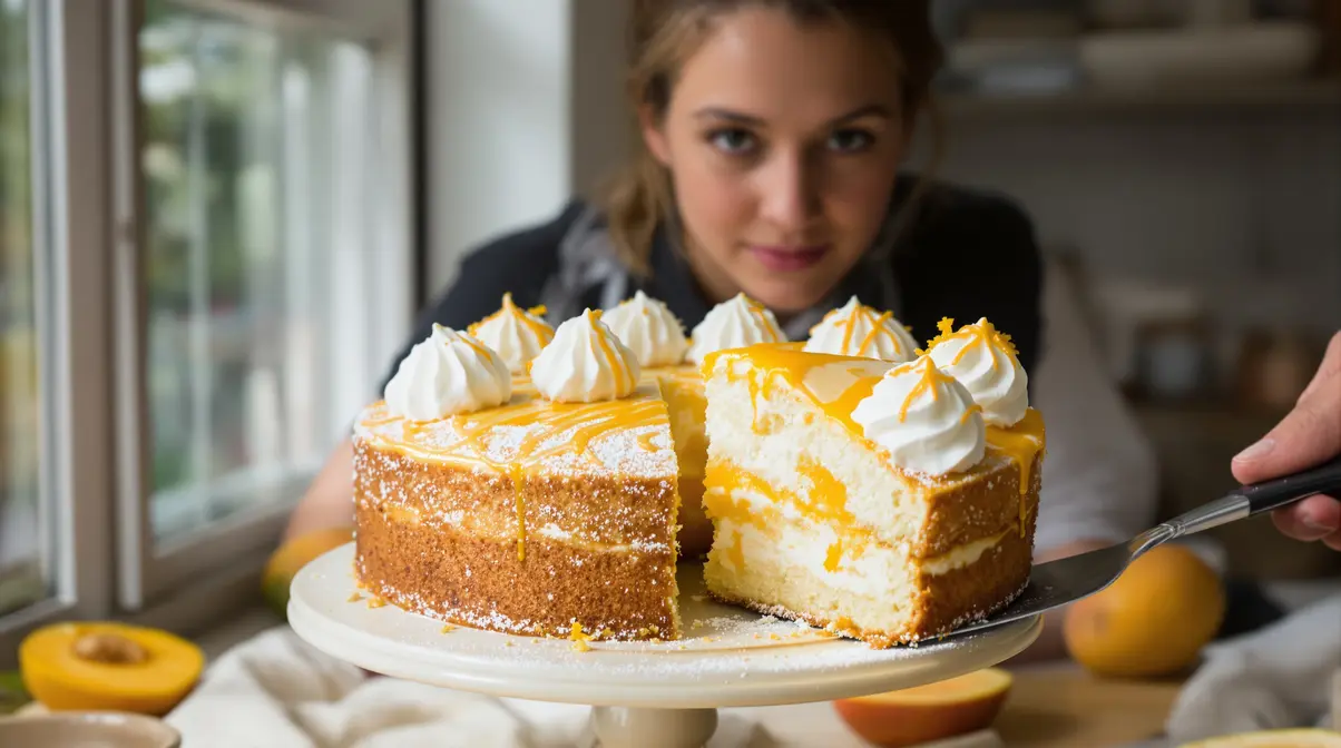 Die Torte sieht auf einer hellen Platte sehr frisch aus. Ein paar Mangostreifen oder kleine Minzblätter passen gut dazu. Das ist kein Muss. Aber genau solche Kleinigkeiten machen aus einem guten Kuchen einen echten Hingucker.